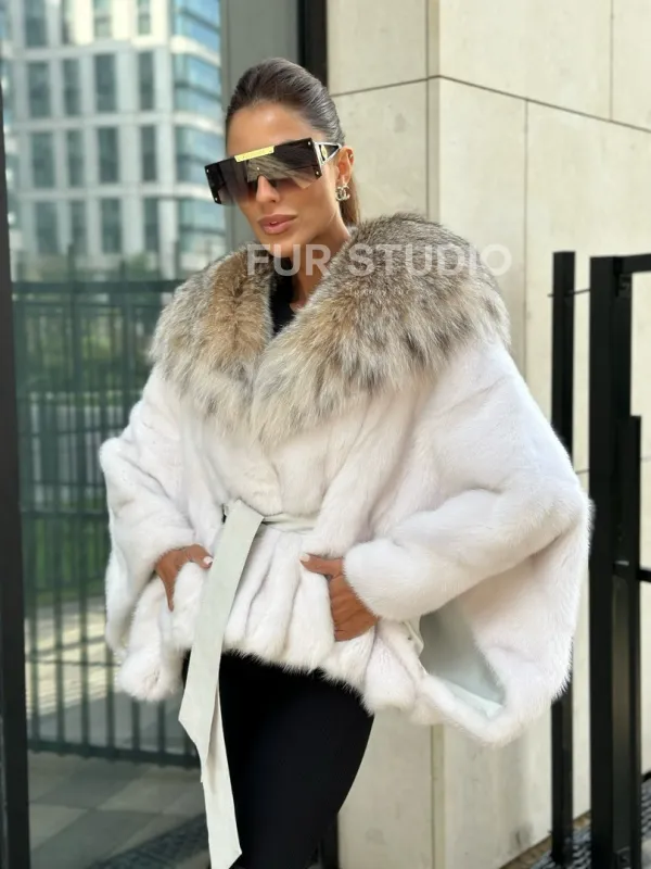 Белое норковое манто с капюшоном из меха рыси – выбор девушек, которые готовы экспериментировать. Летучка сделает ваш образ легким и воздушным. Необычный цвет напомнит о лете и освежит ваш стиль. Нежный мех бережно согреет владелицу в любые холода. Шикарный капюшон из рыси позаботится, чтобы волосы были в тепле.