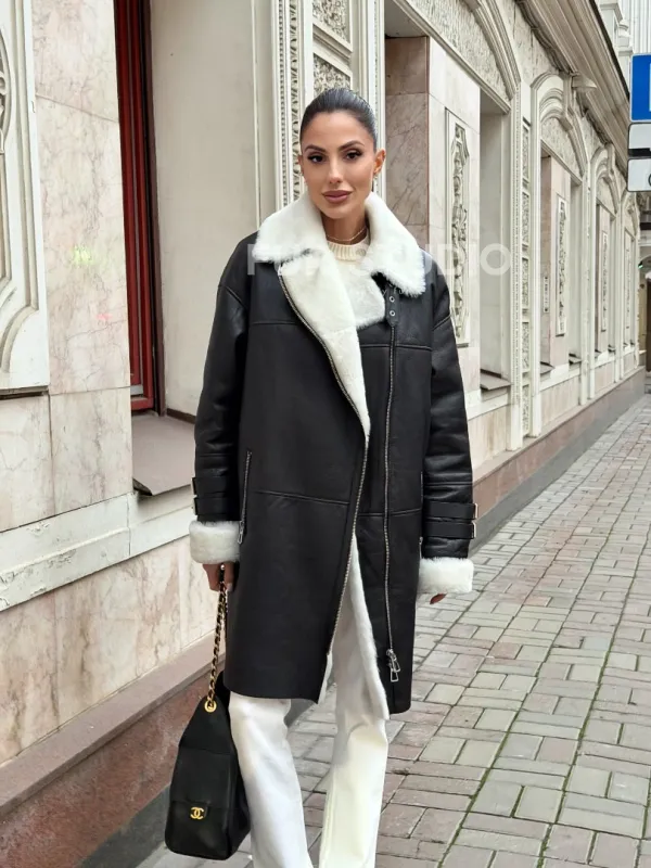 Дубленка авиатор длинная на белой овчине. Модель предлагается в размерах от 42 до 56. Оптимальная длина моделей 90-95 см подчеркивает линии вашей фигуры. Эта дубленка станет неотъемлемой частью гардероба для тех, кто предпочитает роскошь и утонченность натуральной кожи.