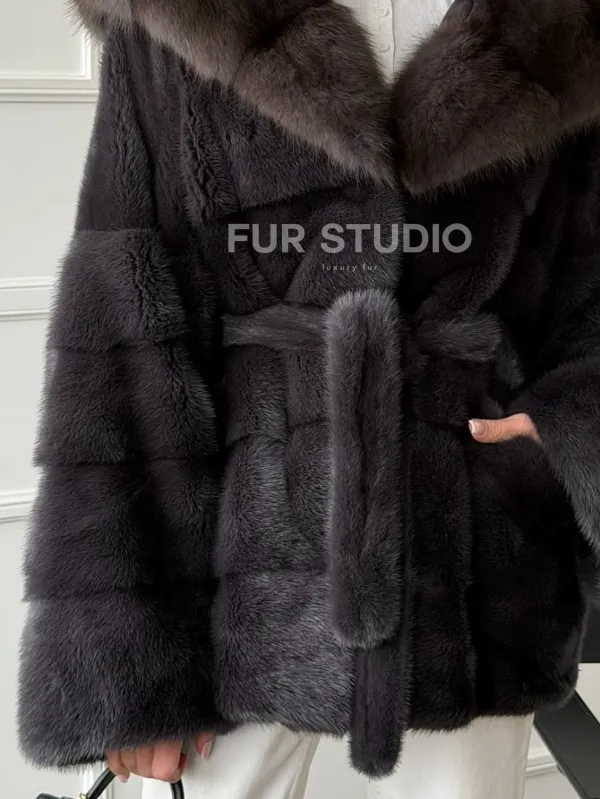 Графитовая шуба с капюшоном из куницы 102657