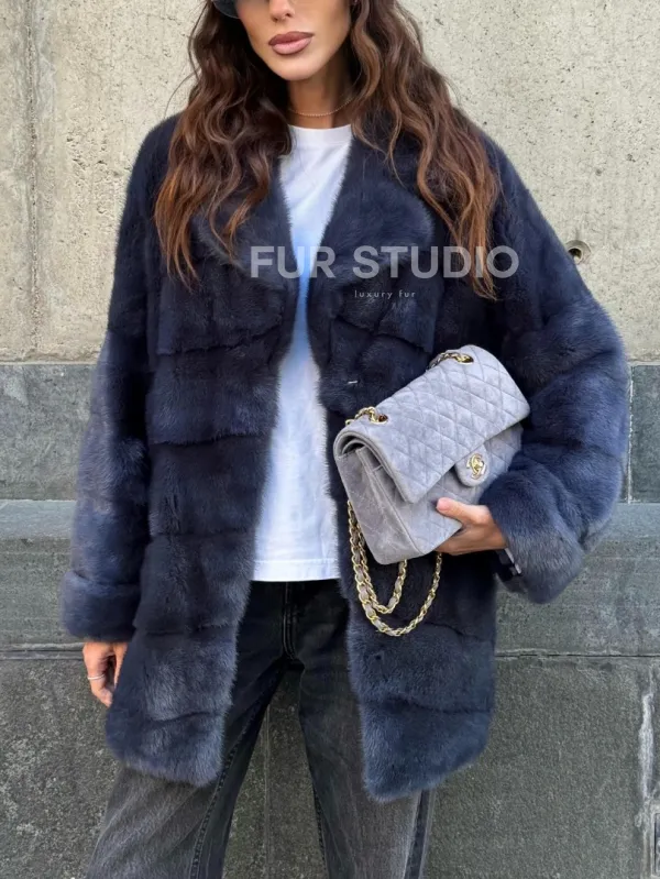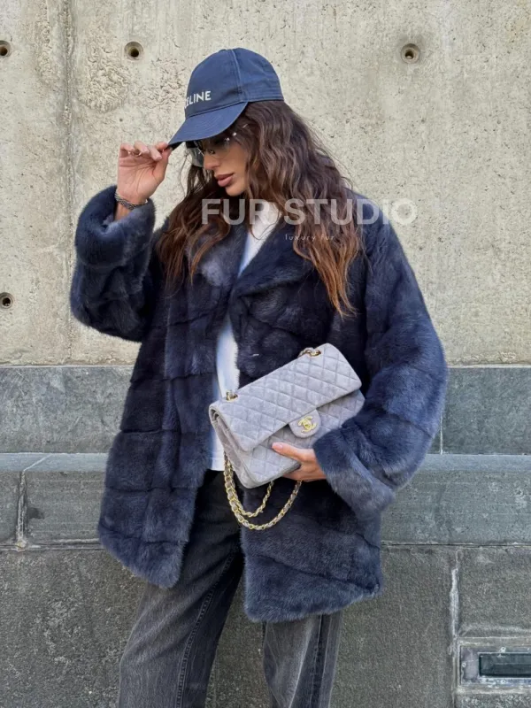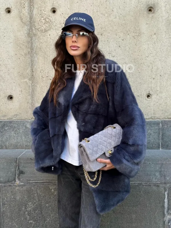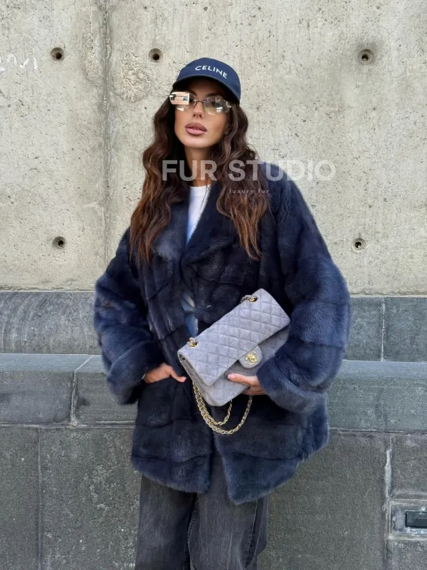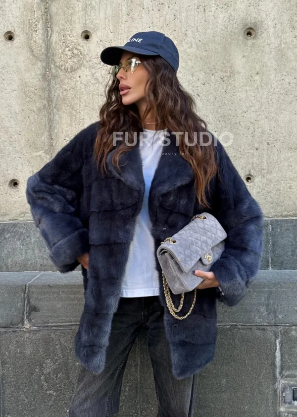 Мех данной шубы аукционная норка, цвет синий. Предлагается в размерах от 42 до 50. Длина модели 70-75 см, что выгодно подчеркивает фигуру девушек. Эта модель идеально подойдет для девушек и женщин, предпочитающих роскошные натуральные меха.
