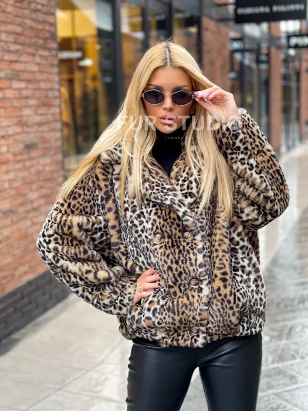 Короткая шуба под леопард из экомеха – выбор девушек, которые идут в ногу со временем. Изделия из экомеха прекрасная альтернатива для тех, кто хочет выглядеть стильно, но бюджет ограничен. Оптимальная длина комфортна в носке и не сковывает движение, что удобно при вождении машины. Теплый мех согреет в прохладное время года. Широкие рукава подчеркнут изящество кистей.