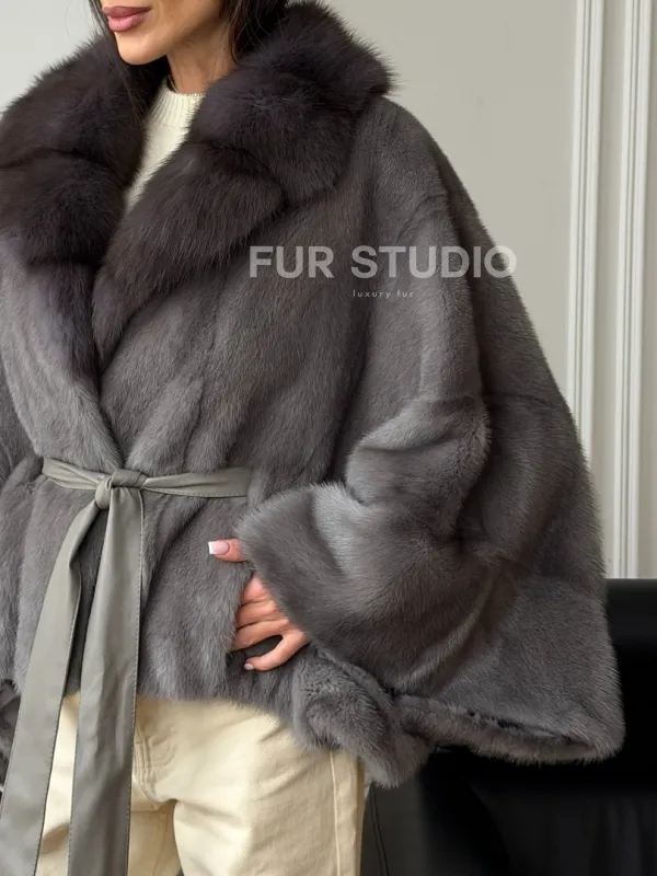 Мех данной шубы аукционная норка, цвет серый. Предлагается в размерах от 38 до 60 (oversize). Длина модели 50-55 см, что выгодно подчеркивает фигуру девушек. Эта модель идеально подойдет для девушек и женщин, предпочитающих роскошные натуральные меха.
