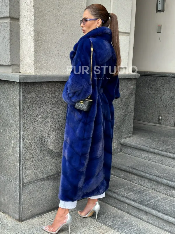 Мех данной шубы аукционная норка, цвет синий. Предлагается в размерах от 42 до 50. Длина модели 115-120 см, что выгодно подчеркивает фигуру девушек. Эта модель идеально подойдет для девушек и женщин, предпочитающих роскошные натуральные меха.