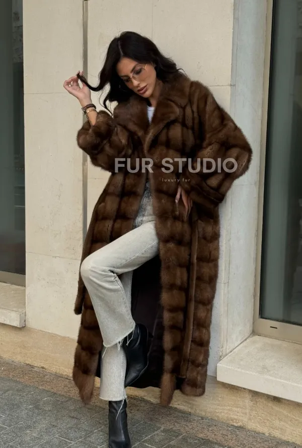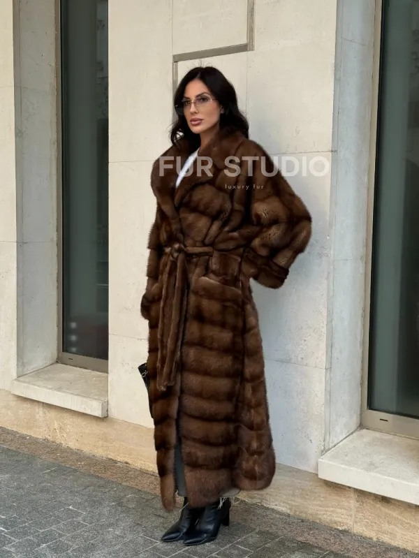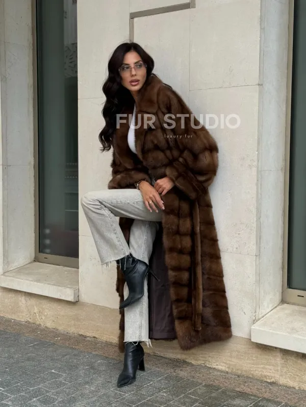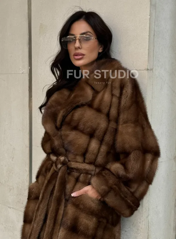Прямой крой зрительно увеличит рост и скроет недостатки фигуры. Меховой пояс выгодно очертит талию и создаст силуэт песочных часов. В шубе вы будете выглядеть женственно и лаконично. Широкие манжеты подчеркнут изящество кистей. Купить норковую шубу в цвете соболь с английским воротником могут девушки, которые разбираются в моде и имеют безукоризненный вкус.