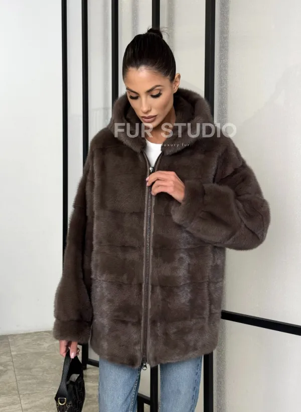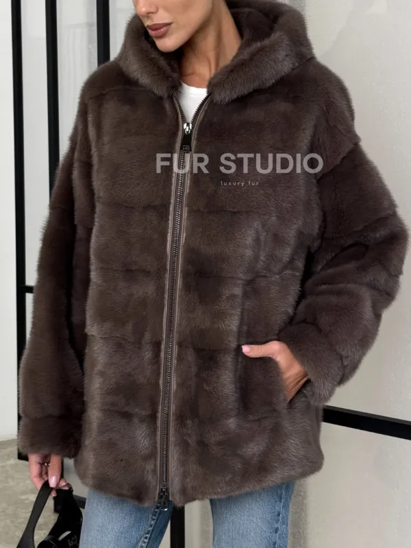 Норковый полушубок с капюшоном на молнии 101389