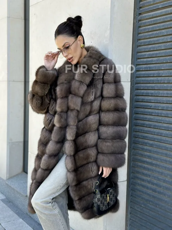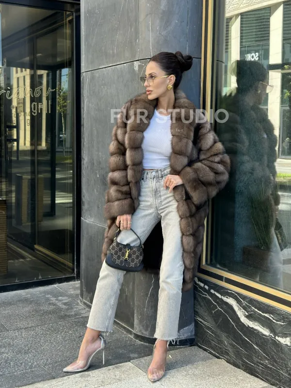 Легкая и стильная шуба из темного меха баргузинского соболя в длине миди — выбор деловых и активных женщин. Эта модель отлично подходит тем, кто ездит за рулем, но также и для любительниц прогуливаться пешком в любую погоду.