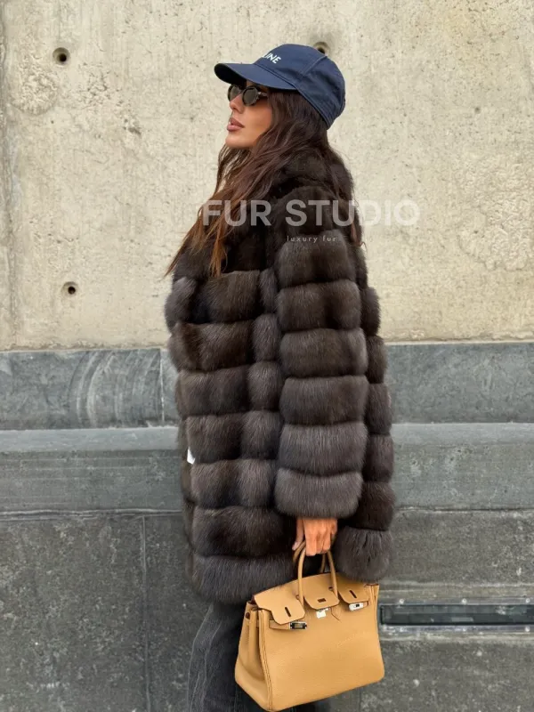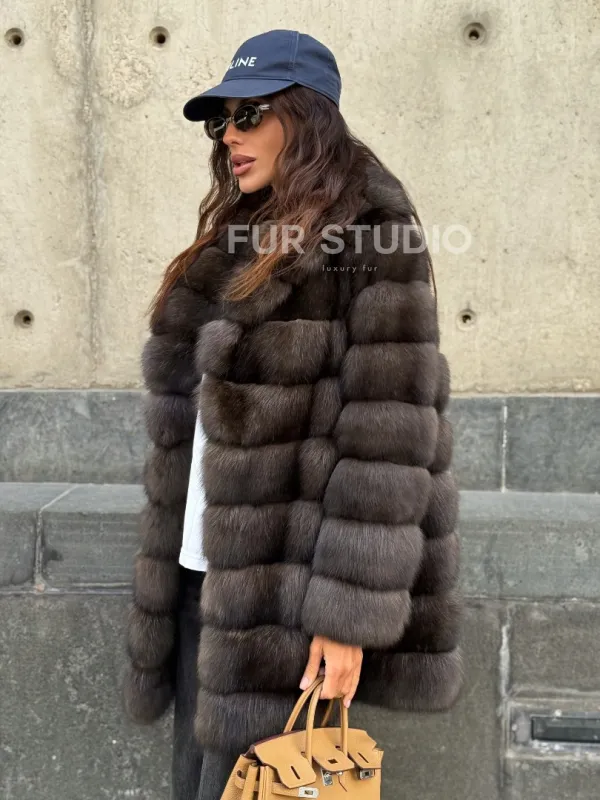 Оптимальная длина удобна в носке, не сковывает движение. Воротник стойка позаботится о шее в непогоду и подчеркнет ее изящество. Широкие рукава выделят тонкие кисти. Прямой крой удлиняет силуэт и зрительно скрывает недостатки фигуры. Купить шубу из меха соболя станет отличным вложением для женщин, которые не привыкли себе в чем-то отказывать.