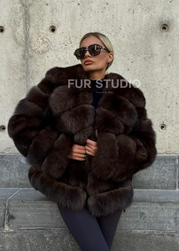 Мех данной шубы финский песец, цвет коричневый. Предлагается в размерах от 42 до 48. Длина модели 60-65 см, что выгодно подчеркивает фигуру девушек. Эта модель идеально подойдет для девушек и женщин, предпочитающих роскошные натуральные меха.